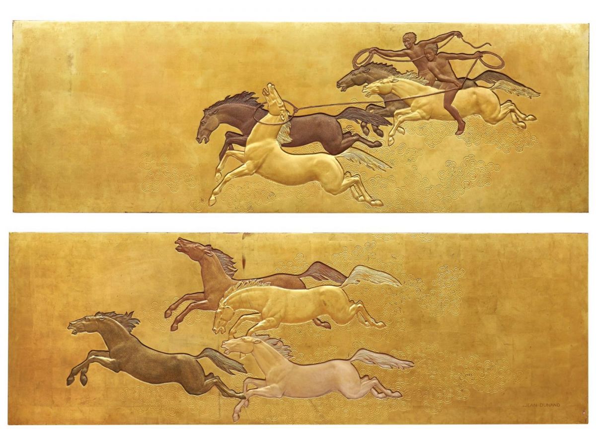Le thème de la Conquête du cheval est traité pour la première fois par Jean Dunand dans le cadre de la décoration monumentale du fumoir du paquebot Normandie inauguré en 1935. Il sera par la suite développé par l'artiste en des panneaux de plus petite taille destinés aux collectionneurs privés.